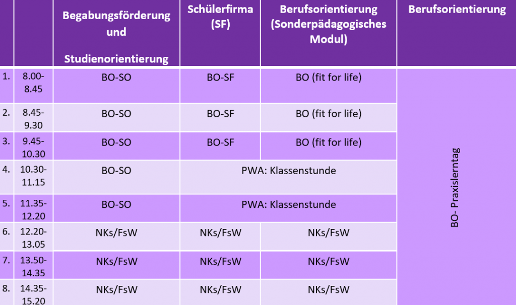 Der BO-Mittwoch bildet das organisatorische und inhaltliche Kernstück der praxisnahen Anschlussorientierung. Als eine Schule für alle mit Förderschwerpunkt Inklusion ermöglicht der BO-Mittwoch sowohl leistungsbezogene Förderung als auch interessengeleitete Schwerpunktsetzung. Die Zuordnung zu den Bereichen erfolgt – je nach Angebot – über Leistungsnachweise, Empfehlungen, Bewerbungsverfahren und individuelle Schwerpunktentscheidungen der Schülerinnen und Schüler in Abstimmung mit den Eltern.