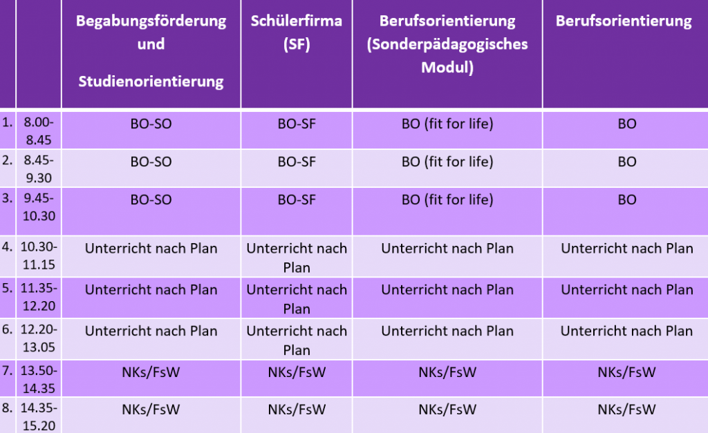 Die folgenden Übersichten zeigen die zeitliche Struktur des BO-Mittwochs in den Jahrgängen 9 und 10.